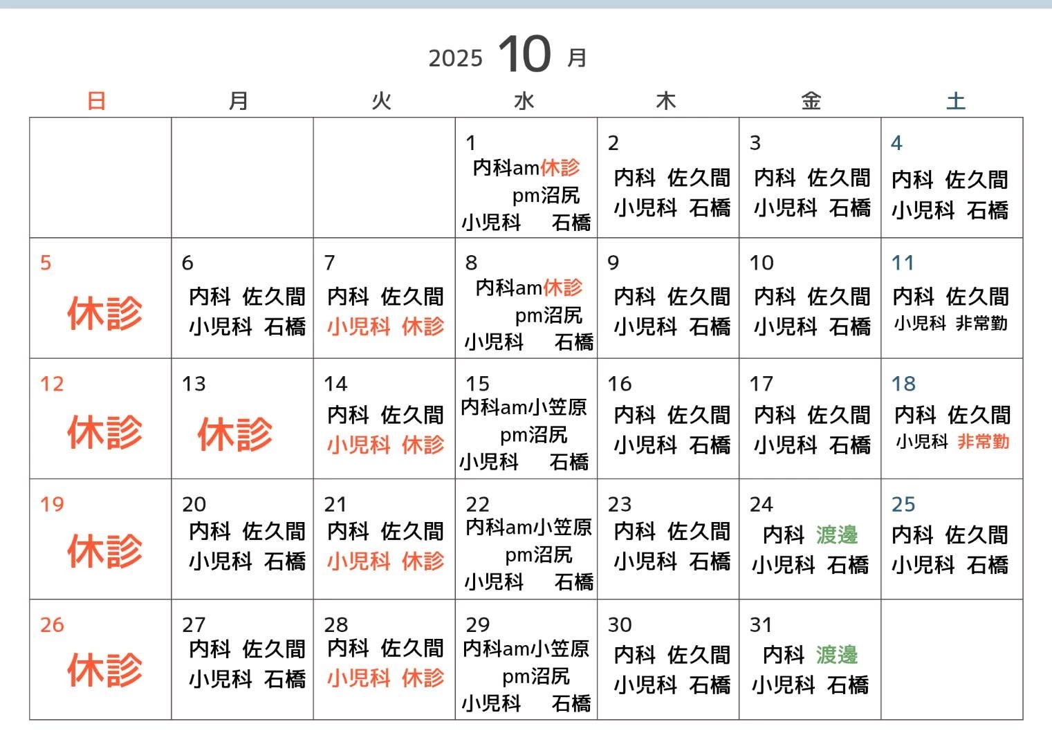 10月の担当医予定表となります。10月より㈬の午後担当医が変更になります。非常勤医師の沼尻先生が担当致します。石井先生と同じく専門は循環器内科ですが何でもご相談ください。