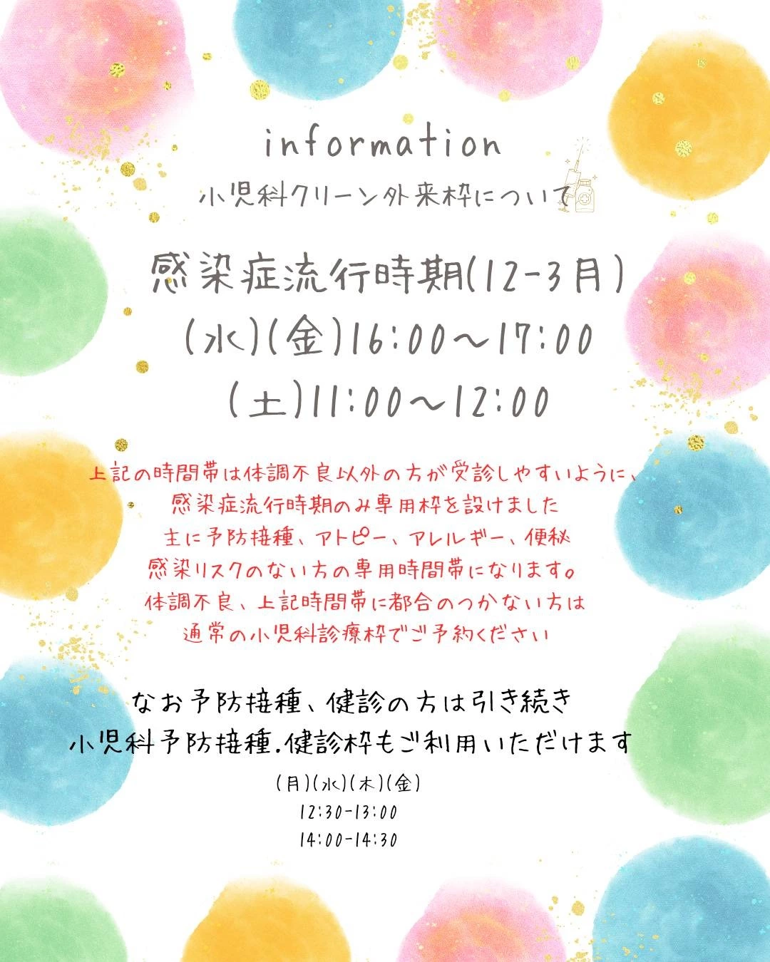 小児科感染症時期のクリーン外来について 2025-11-13 03:13:15 UTC 小児科では感染症時期(12-3月まで)クリーン外来を設置致しました。感染リスクの少ない時間帯になります。ご希望の方は(小児科クリーン外来)の枠を取得ください。症状でお困りの場合はお問い合わせください。