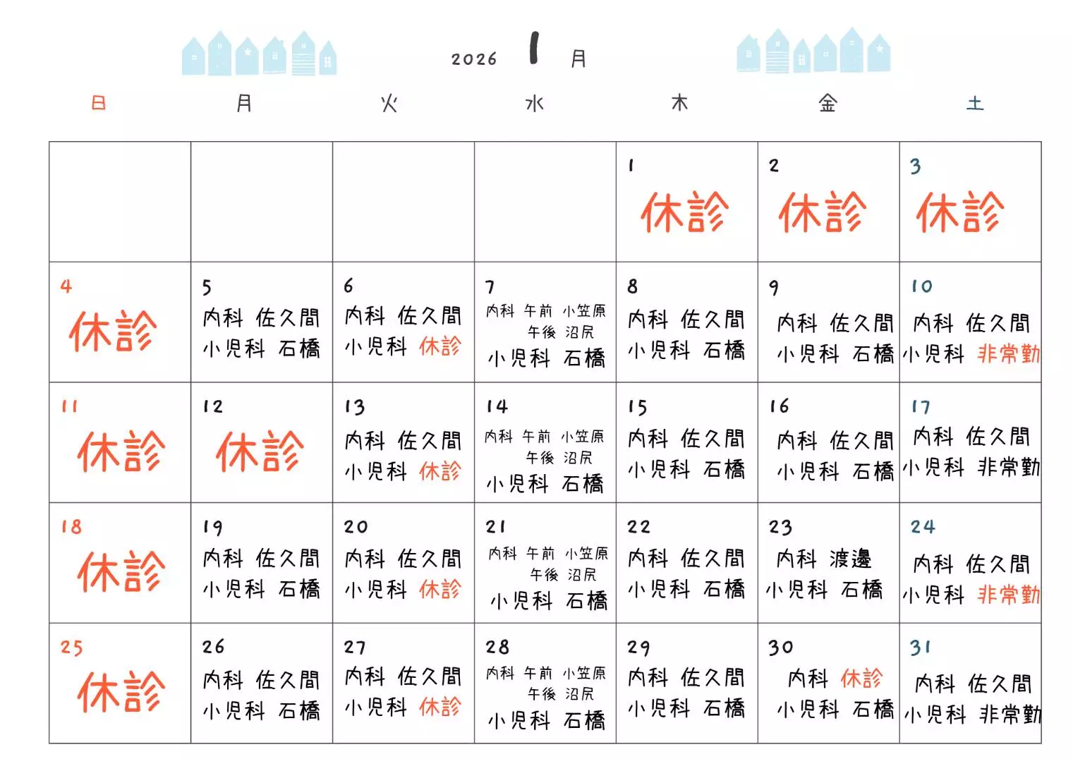 1月診療担当医表 2025-12-18 01:47:26 UTC 1月の診療担当医表です。年末年始の休診は12/28より1/4までとなります。新年からもスタッフ一同、丁寧な診療と対応で地域の皆様の健康の手助けができればと思っております。 どうぞよろしくお願いいたします。