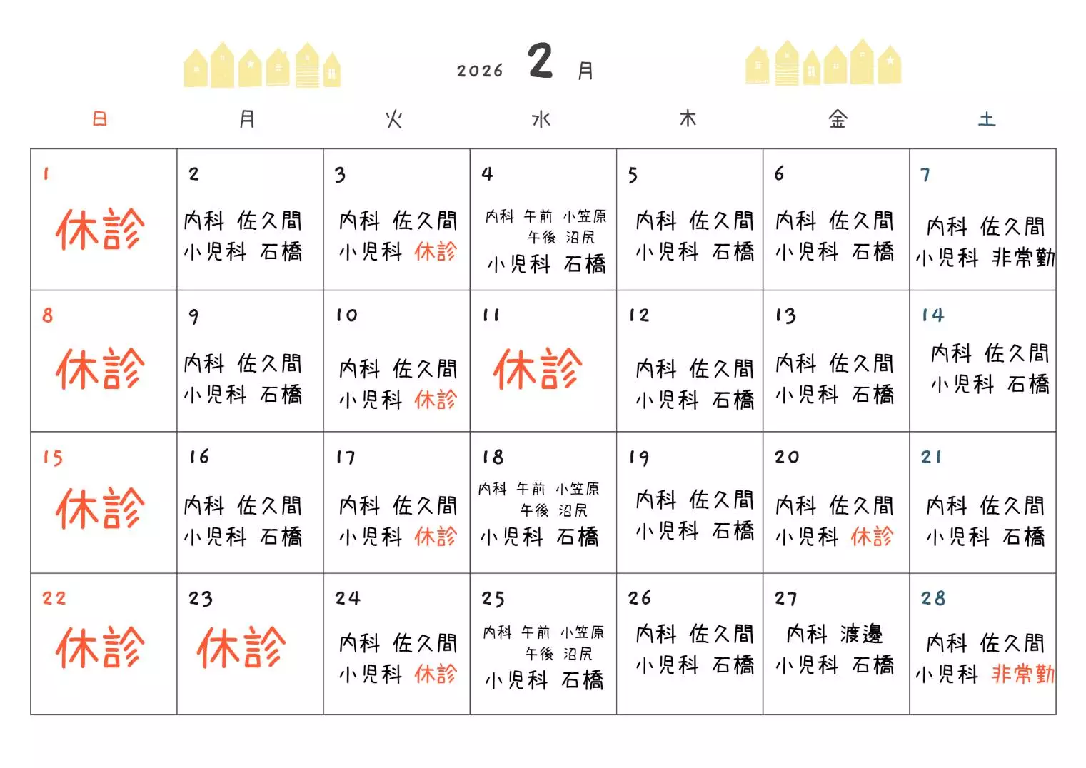 2月の担当医表となります。2/20㈮小児科は終日臨時休診とさせていただきます。