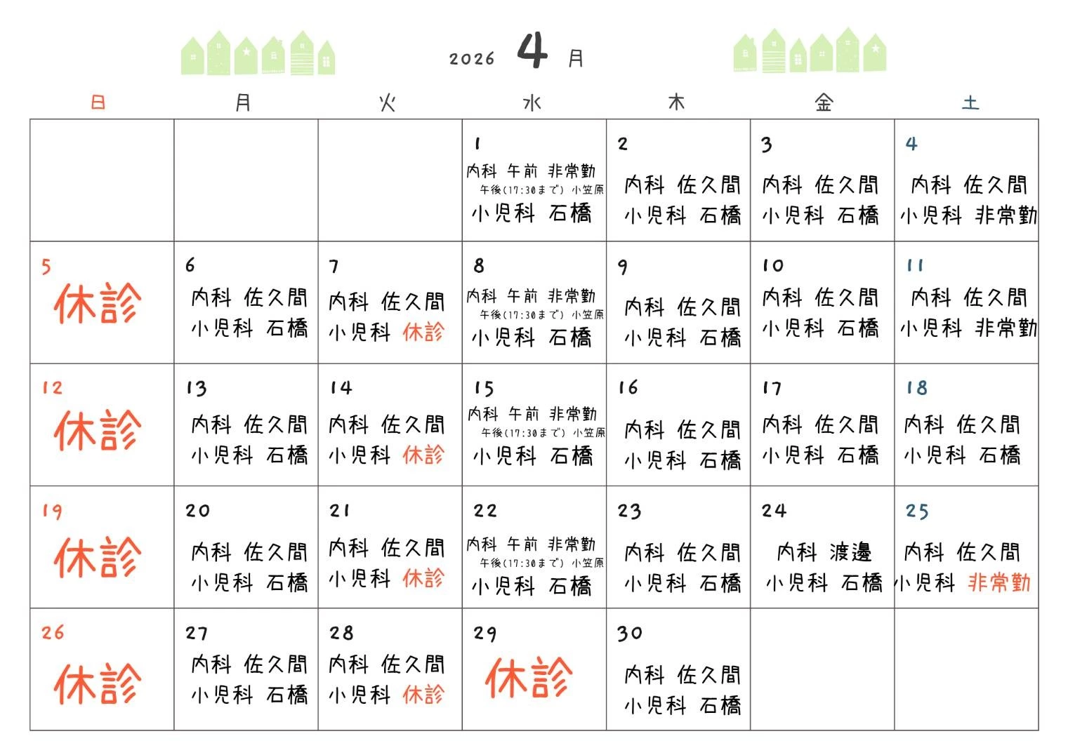 4月診療担当医表 診療体制の変更のお知らせ 2026-03-19 02:39:12 UTC 4月の診療担当医表です。4月より担当医の変更があります。水曜日午前に昭和大学より非常勤医師、午後に小笠原医師(17:30まで)となります。 なお、水曜日の内科は17:15が最終予約の受付となります。体調不良の感冒症状は小児科医師の診察になりますが通常通り17:45まで可能となります。